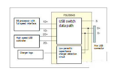 基于兩個主要原因,在此設(shè)計中需要低導(dǎo)通電容開關(guān)。首先,由于基帶處理器和高速?當(dāng)手機進入高速模式時,USB?控制器輸出在連接器側(cè)共享相同的D + / D-引腳USB 2.0模式(例如音樂下載或閃存功能),必須降低基帶USB1.1 /。2.0全速控制器的輸出電容。D + / D-線上的任何附加電容都會損壞Hi-Speed的眼圖USB信號。其次,在高速USB模式下,必須切斷D + / D-線上的多余走線,以有效避免480Mbps USB信號快速上升/下降沿引起的信號反射。